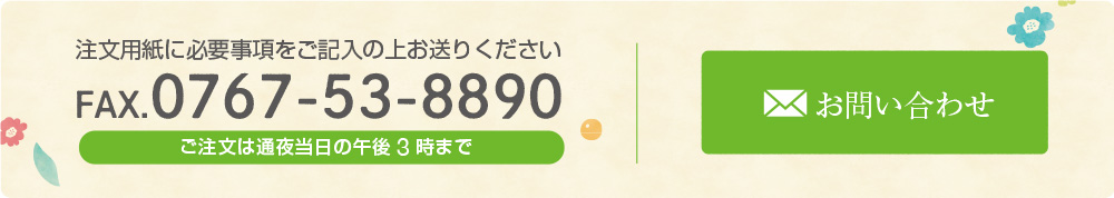 ご注文は、注文用紙に必要事項をご記入の上、FAX:0767-53-8890までお送りください。